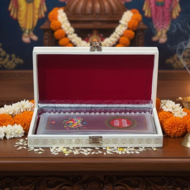 Comes in a velvet box to protect the book and make gifting more special — ideal for housewarming, puja ceremonies, anniversaries, and festivals.
